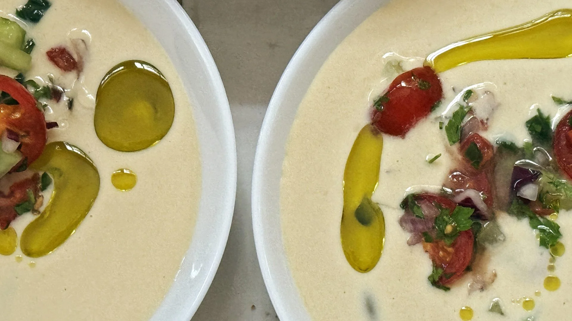 With the blender running on a low speed, slowly stream in the olive oil. (This creates a stable emulsion and gives the soup its characteristic white glow and silken mouthfeel.)